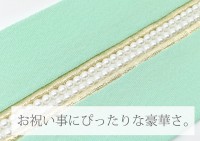 華やかな金糸の織り込まれた緑色の地に、金色そして白いパールがぎっしりと並んだ美しい一品です。