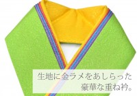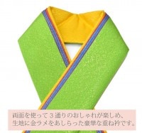 両面を使って3通りのおしゃれが楽しめ、生地に金ラメをあしらった豪華な重ね衿です。