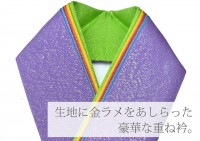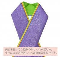 両面を使って3通りのおしゃれが楽しめ、生地に金ラメをあしらった豪華な重ね衿です。