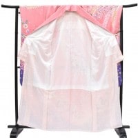 ピンク色の花文様が施された振袖に、お着物にあったサイズの振袖用の長襦袢が付いた2点セットの商品です。