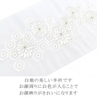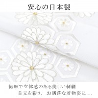 こちらの半衿は白色に亀甲花 菊の文様が華やかでかわいい刺繍が施されており、どんなお着物にも似合う半衿となっております。