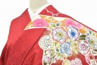 全体的に銀通しされて赤色地に辻が花文様や七宝、桜の柄が施され、熨斗目文様が全体的にあしらわれております。金彩や金箔が華やかさを添えます。