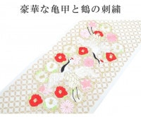 こちらの半衿は金色の七宝柄に赤色とピンク色の花と鶴・亀甲文様の刺繍が施され華やかで使い勝手がいいどんなお着物にも似合う半衿となっております。
